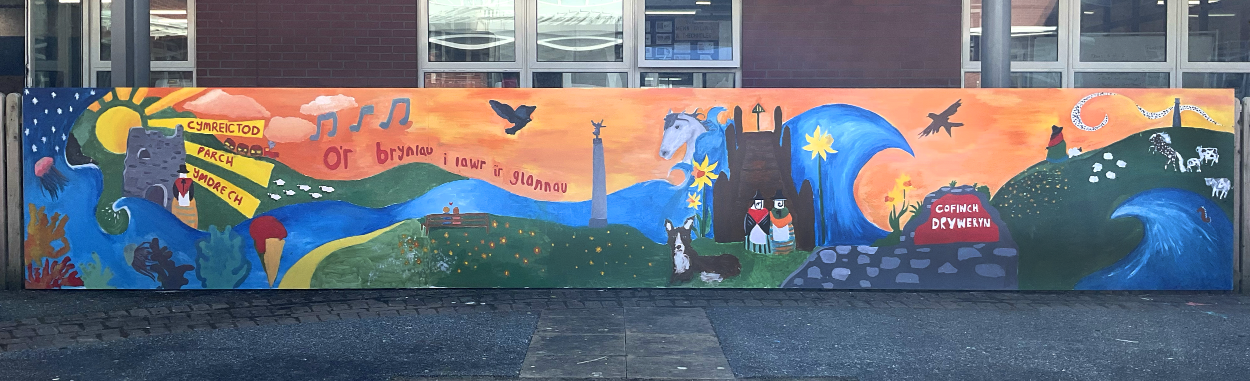 The mural celebrates the Welsh language, represented by a Welsh lady in a traditional hat worn by women as part of the Welsh national costume. Along with the lines from our Welsh National Anthem.